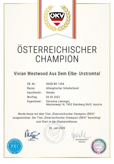 ” Vivian Westwood aus dem Elbe-Urstromtal” gewann ihr letztes CAC auf der Ausstellung in Klagenfurt am Sonntag den 28.7.2025. Jetzt ist Familie Laminger stolzer Besitzer eines neu gekrönten Österreichischen Champions