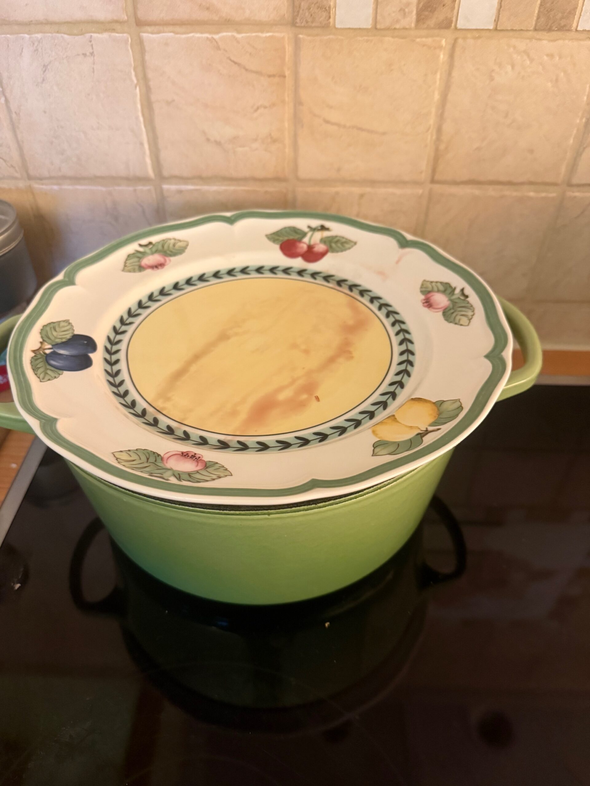 Die Steaks stand ganz hinten gegen die Wand auf der Kochplatte, erhöhte auf einem Topf.