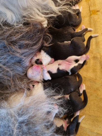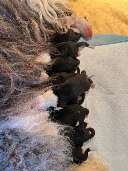 “Ocean’s” Bauch war sehr dick, ich hatte das vermuten, das es mehr als 8 Welpen werden könnten. Punktlich in der Nacht vom 59 auf den 60. Tag der Trächtigkeit wurden die Welpen geboren. 11 Stück, 5 Rüden und 6 Hündinnen in 7 Stunden. Zu meiner grossen Freude, rechtzeitig, so dass ich am Samstag und Sonntag in Dortmund ausstellen konnte.