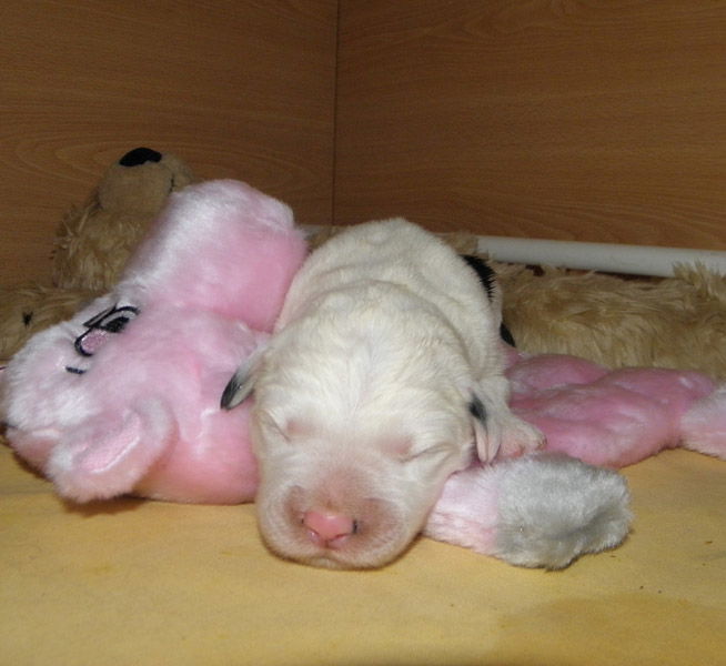 Nur am Dienstag morgen gegen 6 Uhr, nachdem ich innerhalb von 15 Minuten zum 3. Male vom Sofa aufgestanden bin um in die Wurfkiste zu sehen, weil die Welpen piepten, musste ich mit Schrecken feststellen, das ein Rüde tot war. Er lag auf dem Rücken und ich dachte er trinkt bei Socke. Aber das war nicht so, er war mit dem Kopf wohl unter ihren Brustkasten zurecht gekommen und bekam keine Luft mehr. Ich habe sofort versucht ihn zu reanimieren, aber es war vergebens. Für den Rest des Tages war ich deprimiert, wütend und ohne jegliche Energie. Einfach todtraurig.