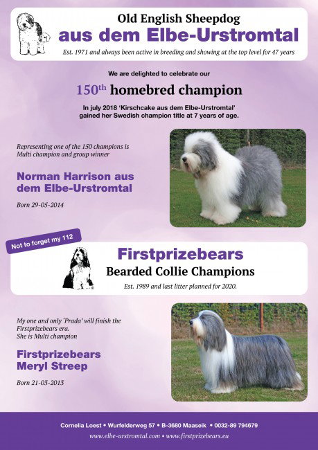 Breeding and showing has always been her passion and the effort, willpower, tears and strength she’s needed in these past 45 years to write this history is, as most dog people would understand, indescribable. Conny has never been on a breed club committee nor become a judge. Every success she’s had is because of the high breeding standard her dogs have. Most of these 150 Champions are made up from dogs that have been campaigned worldwide. Conny’s dogs are writing history in many ways. She owned the first foreign dog to win a CC at Crufts and subsequently was made up as a UK Champion. She also had the First OES who won a Group at the world show in 1981 and she owns the Top all Breed Dog in the Netherlands. This dog is also the top OES in the Netherlands and Denmark. She’s had litters from 7 Champions and has a Top sire that produced over 27 Champion children. There is simply too much to name it all! Conny also breeds Bearded Collies under her other Kennel name “Firstprizebears”, which started in 1989; however she will stop breeding them in the next 3 years and hasn’t shown them since last year. So far Conny has produced 112 Champion Bearded Collies and believes several will follow.Her 150th Champion is the 7 years old “Kirschcake aus dem Elbe-Urstromtal” who became a champion at the show in Alfa on July 1st 2018. Her owner is Marie Bergqvist who lives in Sweden. Congratulations on a great career to Conny and her dogs!