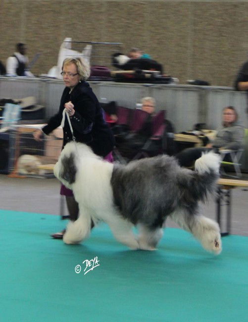 Die Winner Amsterdam findet jedes Jahr eigentlich Ende November in der RAI Messe statt. Meine erste Winner war in 1975 und ich glaube ich habe bis heute keine verpasst. Es ist die grösste und bekannteste Show in den Niederlanden und bei mir immernoch mit viel Spannung und Vorfreude verbunden. Diesmal war alles etwas anders. Wir waren in einen anderen Hallencomplex, die Show war Mitte Dezember und am Freitag gabe es die One-Day Winner, sprich eine CACIB Show mit allen Rassen und das am Freitag den 13. und ich bin abergläubisch! Wenn man an einem Wochentag morgens um 7 Uhr in Amsterdam sein will, weil man um 7.30 in die Halle kann und noch eingermassen in der Nähe Parken will, ja dann fährt man (sprich Conny und Eef Martens) morgens um 5.15 los. Aufstehen um 3.15, weil alle Hunde rausmüssen, die Showhund mit Socken, das braucht Zeit. Selber habe ich ebenfalls 45 Minuten nötig um vorzeigbar zu sein. Wir hatten den Lasse und die Geddes, die Beardies zum Ausstellen dabei Die junge Beardiehündin Prada zum lernen und King unseren tollen OES Rüden. Herr Wieldraaier, ein betagter Herr, der schon seit Ewigkeiten Richter ist und bei dem ich unzählige Male ausgestellt habe, richtet die OES. Es waren nur 4 angemeldet, 2 Rüden und 2 Hündinnen. Normalerweise hätte ich gar nicht angemeldet, aber: seitdem der King in Bleiswijk Res- Best in Show gewonnen hatte, war er plötzlich mit seinen 3 Shows in der Punktzahl für die Top OES Showhund 2013 hochgeschnellt. Die Besitzerin, des Hundes, der vor mir stand, hatte sich sehr abfällig über meinen King geäussert und ich wollte doch versuchen, ihr zu zeigen, das King besser war. “King” war für die Winner am Sonntag nicht gemeldet, konnte also keine Punkte gewinnen. Wir hatten alle Karte auf unsere “Jadore” gesetzt. “King” wurde bei Herrn Wieldraaier bester Rüde und nicht Bester der Rasse. Meine Enttäuschung war gross. Aber so ist es eben. Das machte den Punktestand noch spannender.